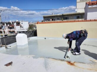 防水主剤1層目塗布・ガラスクロス貼り付け ⇒