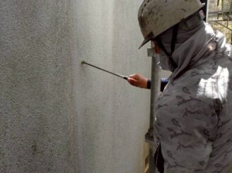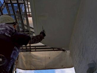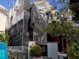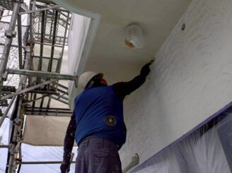 足場設置後、打診検査・マーキング① ⇒