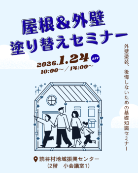 ※ご予約制・無料 ご参加予定の方はお手数ですが、 下記のフリーダイヤルかHPよりご予約をお願いいたします。 0120-272-552 ※今回の講座は、塗装・防水に対する知識を身につけてもらう事を目的としています。 |
